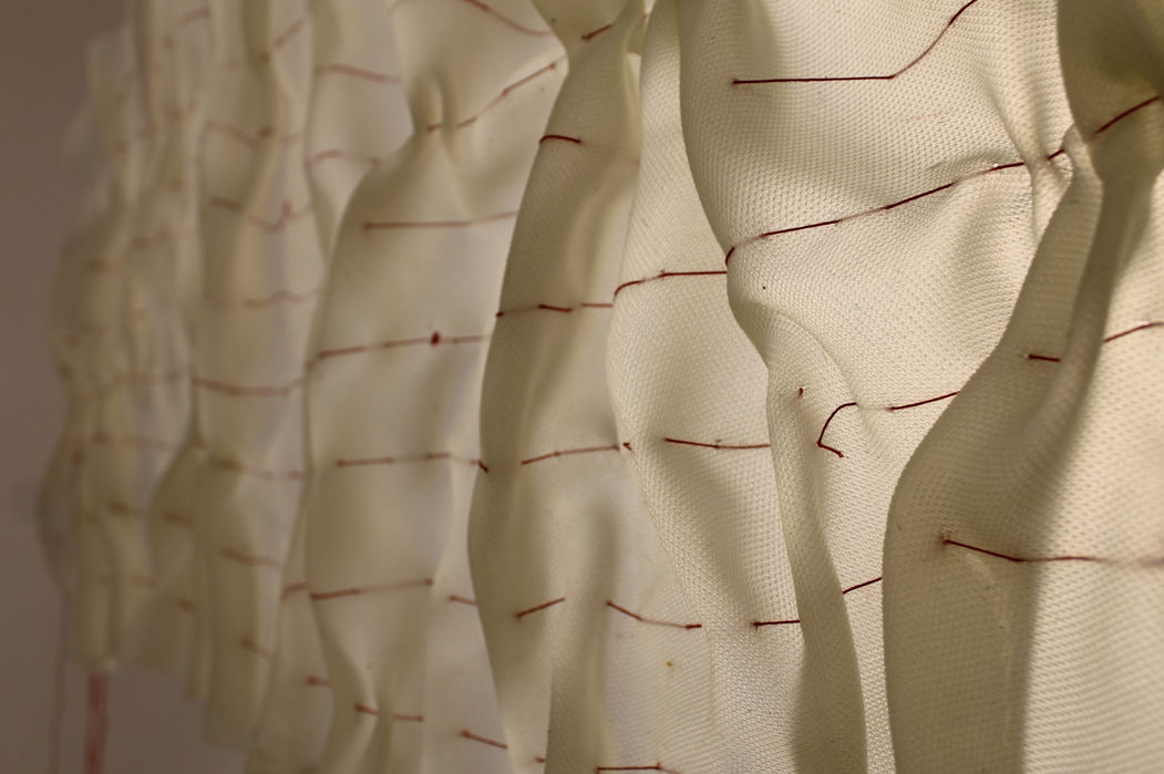 The artwork freezes the ruffling action over the fabric, generating a complex dynamic surface. The red embroidery thread, inserted in the technical frozen textile of the prepreg, serves as the structural basis for a careful manual manipulation of the fabric, to create a differentiated surface of variations, a topography of varying intensities, shadows and rhythms. The surface hints for possible future applications in the field of design and architecture.