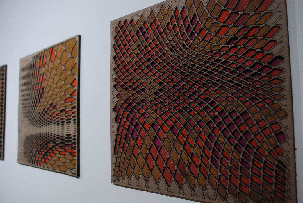 A three dimensional textile artwork that relates to treated animal skins, and embodies the quest for flowing double curved surfaces in contemporary design. The study of scales and skins of different animals becomes a hand drawing, which than serves as the seed for digital parametric design. The digital pattern, based on complex-curved virtual surface geometry, goes through final manual elaboration, by its coloured interpretation and final graphic touches. The code and the curve join forces to a series of works that examines the generation of a breathing and organic visual, through digital design and fabrication.